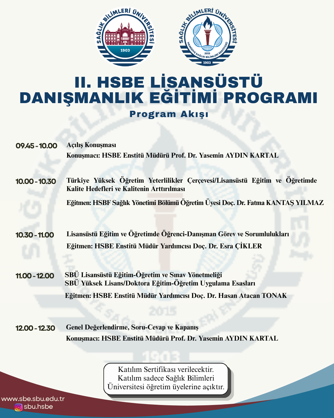 II. Hamidiye Sağlık Bilimleri Enstitüsü Lisansüstü Danışmanlık Eğitimi Programına tüm öğretim üyelerimizin katılımı beklenmektedir.